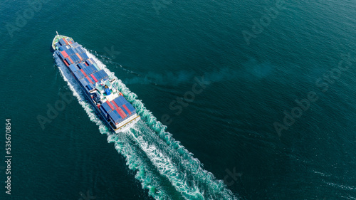 Stern of large cargo ship import export container box on the ocean sea on blue sky back ground concept transportation logistic and service to customer and supply change