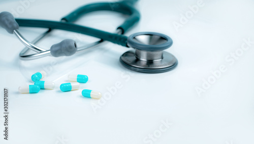 Stethoscope and blue-white capsule pills on doctor table or nurse desk. Health checkup. Medical healthcare and medicine background. Physician tool for patient diagnosis. Cardiology doctor equipment.