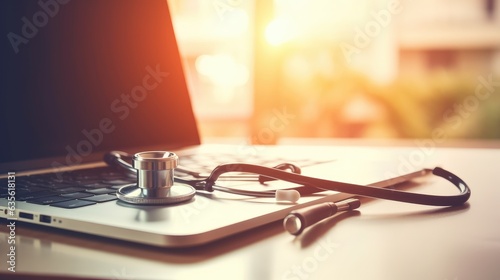 Stethoscope and laptop keyboard on desktop in hospital. Generative AI