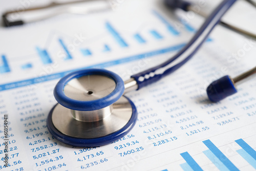 Stethoscope and US dollar banknotes on chart or graph paper, Financial, account, statistics and business data medical health concept.