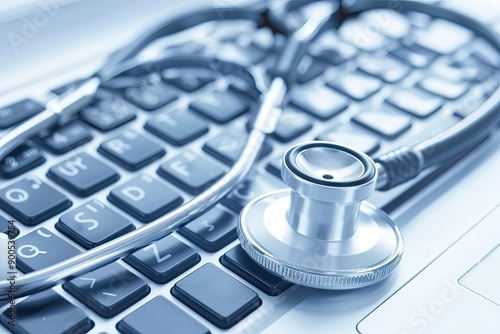 Stethoscope lying on a laptop keyboard, symbolizing the intersection of healthcare and technology in medical digital diagnostics.
