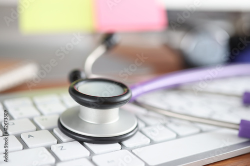 Stethoscope lying on computer keyboard in office closeup