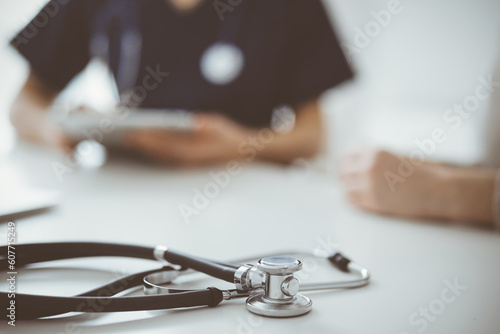 Stethoscope lying on the tablet computer in front of a doctor and patient at the background. Medicine, healthcare concept.
