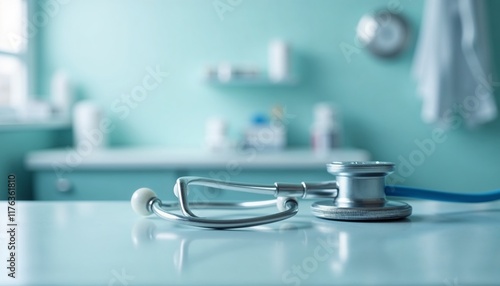 Stethoscope on clinical table in bright medical room with turquoise background and healthcare tools