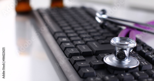 Stethoscope on laptop keyboard. Concept 3D image