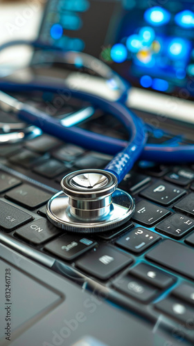 Stethoscope on laptop keyboard illustrating medical cybersecurity, digital health safety, and data protection in healthcare technology during the daytime