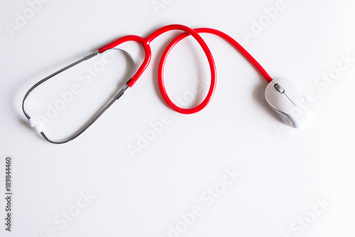 Stethoscope red color with mouse on desk,Medicine online concept,Top view with copy space