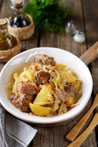 Stewed potatoes with cabbage, carrots, onions, tomato sauce and pork ribs.