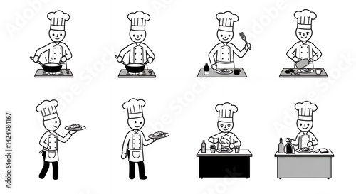 Stick Figure Chefs Cooking Process in Black and White Monochrome Illustration