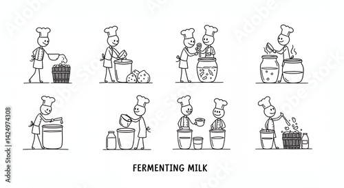 Stick Figure Chefs Fermenting Milk in Black and White Illustration Depicting Cooking Process Stages Minimalist Design For Culinary Guides And Educational Material