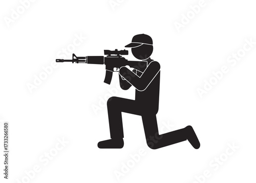 Stick figure icon of a soldier kneeling and aiming a rifle isolated on white background