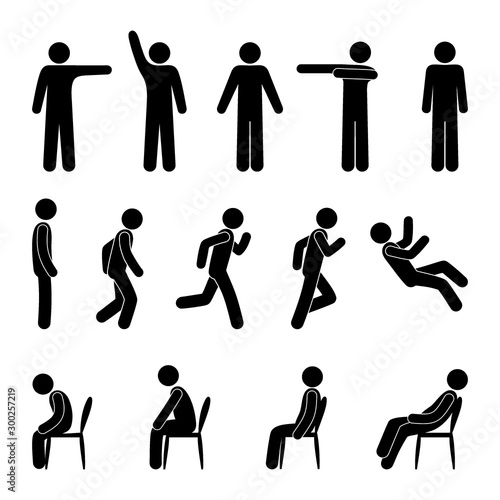 stick figure people in various poses, isolated human silhouettes, a man stands, sits, runs and falls