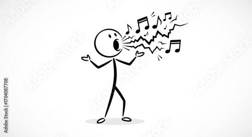Stick figure singing or shouting with musical notes and sound waves, vocal expression concept, simple cartoon illustration.