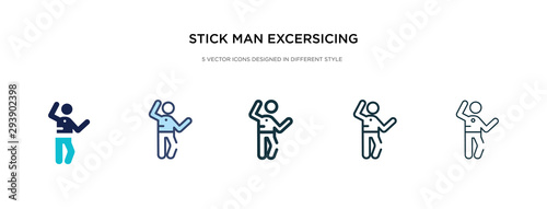 stick man excersicing icon in different style vector illustration. two colored and black stick man excersicing vector icons designed in filled, outline, line and stroke style can be used for web,