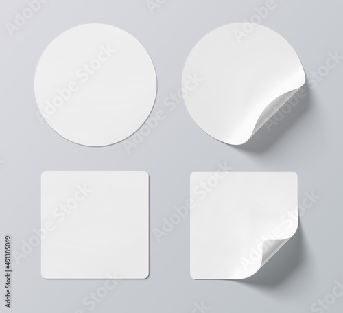 Sticker mockup with curled corner isolated on white background. Circular and squared adhesive label with bent side. 3D rendering