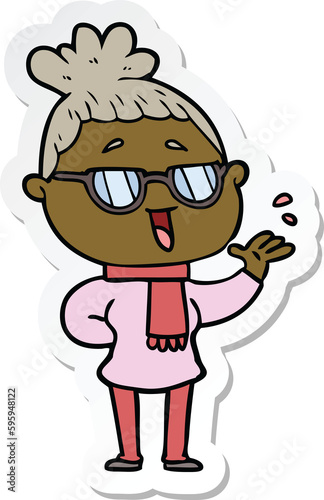 sticker of a cartoon happy woman wearing spectacles