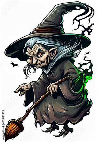 Sticker of an evil, old witch with a broom on a white background. AI Generated