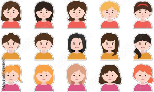 Sticker set of woman avatar icons. Vector illustration isolated on transparent background.