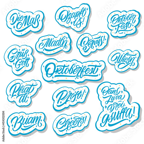 Sticker vector for Oktoberfest. Translation from German; Good day, Meadows, Bottom up!, The measure, May the Lord protect you, boy and girl, one, two, three, we drink! Oktoberfest.