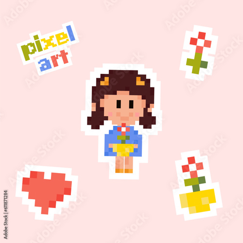 Stickers in stuyle pixel art. Girl with flower, heart. Vector illustration
