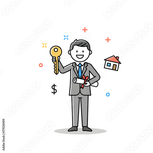 Stickman realtor holding a key and small house model, symbolizing real estate ownership, marketing, and property success.