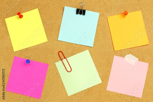 Sticky notes of various colors and fasteners on a bulletin board