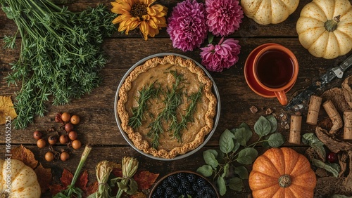 Still life featuring a warm orange cup of herbal infusion with pie and pumpkin on a wooden table