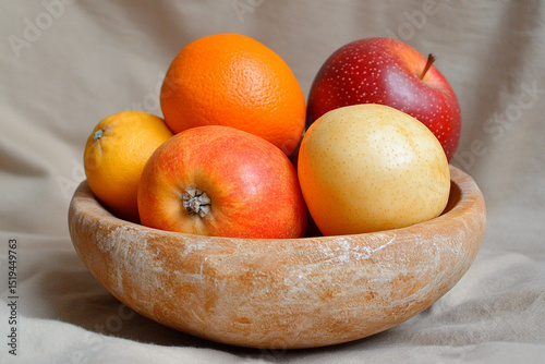 Still life featuring colorful fruits in a rustic bowl