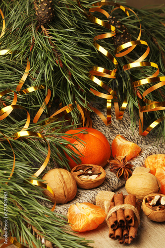 Still life formed with pine branches and New Year sweets