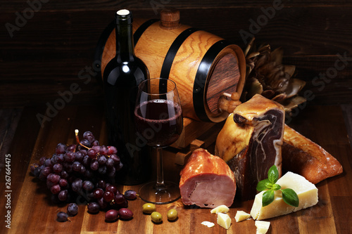 Still life in a rustic style. Grapes on a wooden table with a bottle of wine and meat and cheese. Antipasto and red wine