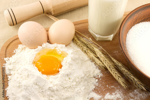 Still life of bread, eggs, cereals, flour and kitchen tools on a wooden board