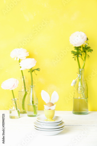 Still life of cut flowers in bottles and Easter egg with bunny ears