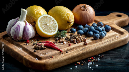 Still life of garlic lemons onion blueberries and spices on a wooden cutting board