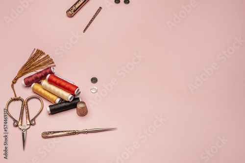 Still life with spools of thread of various colors together with some old-style copper scissors with other accessories in the same style