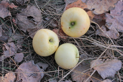 Still life with white ripe apples on the dry grass and autumn leaves background . Close-up