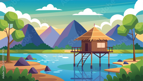 Stilt House on Lake with Mountain Views, Tree Silhouettes, and Cloudy Sky