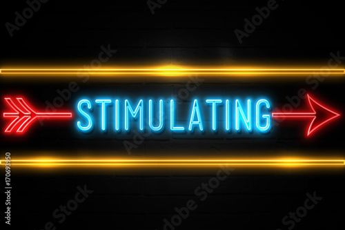 Stimulating - fluorescent Neon Sign on brickwall Front view