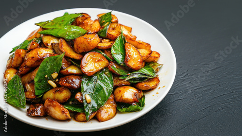 Stir fried cassava leaves with garlic and soy sauce on white plate