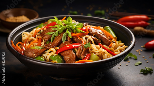 Stir fry noodles with beef and vegetables in black bowl on dark background