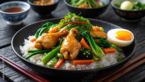 Stir-fried chicken and vegetables in a tangy-sweet sauce served with rice and crispy egg