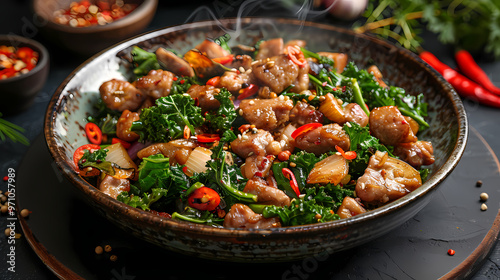 Stir-fried kale vegetable with crispy pork Add fried garlicFaint smoke
