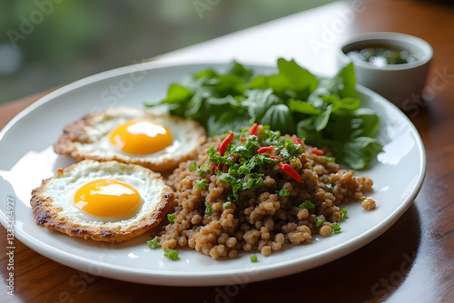 Stir-fried minced pork with holy basil, served with a fried egg with white edges and white rice on a white plate on a brown wooden table.