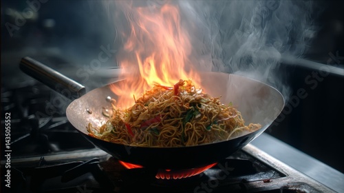 Stirfried Noodles, Flame, and Steam Asian Cuisine in a Wok over Heat in Restaurant