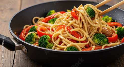 Stirfried Noodles with Broccoli and Red Bell Pepper in a Pan.