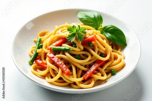 Stir-fried noodles with vegetables on white, vibrant colors , broccoli, eat
