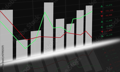 Stock Market concept 3D web illustration. Stock market screen with charts, graphs and numbers. Finance and economy pattern. Perspective view of market charts. Trendy design.