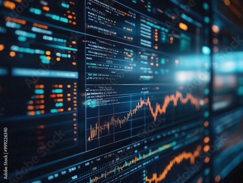 Stock market graphs showing rising and falling trends on multiple screens, financial setting, sharp focus, high detail