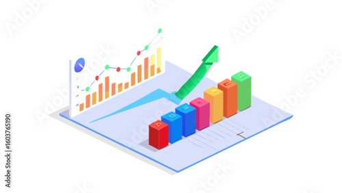 Stock market growth chart showing financial business data analysis and investment performance trend report isometric