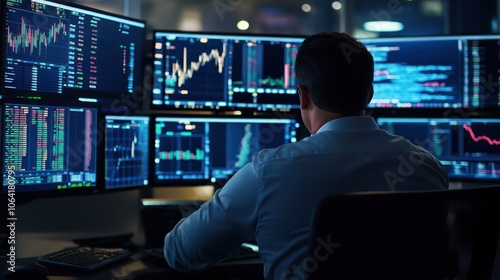 Stock market professional using multiple screens to analyze market data and investment opportunities in a trading room