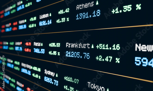 Stock market screen with ticker index information. Trading, investment, business, market research, analyzing. 3D illustration